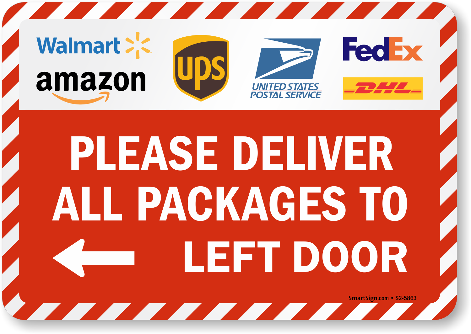 Package Delivery Sign: Please Deliver All Packages To Left/Right Door (With Amazon, FedEx, Walmart, UPS & USPS, DHL Graphics) (Choose Right/Left Arrow) S2-5863 Learn More...