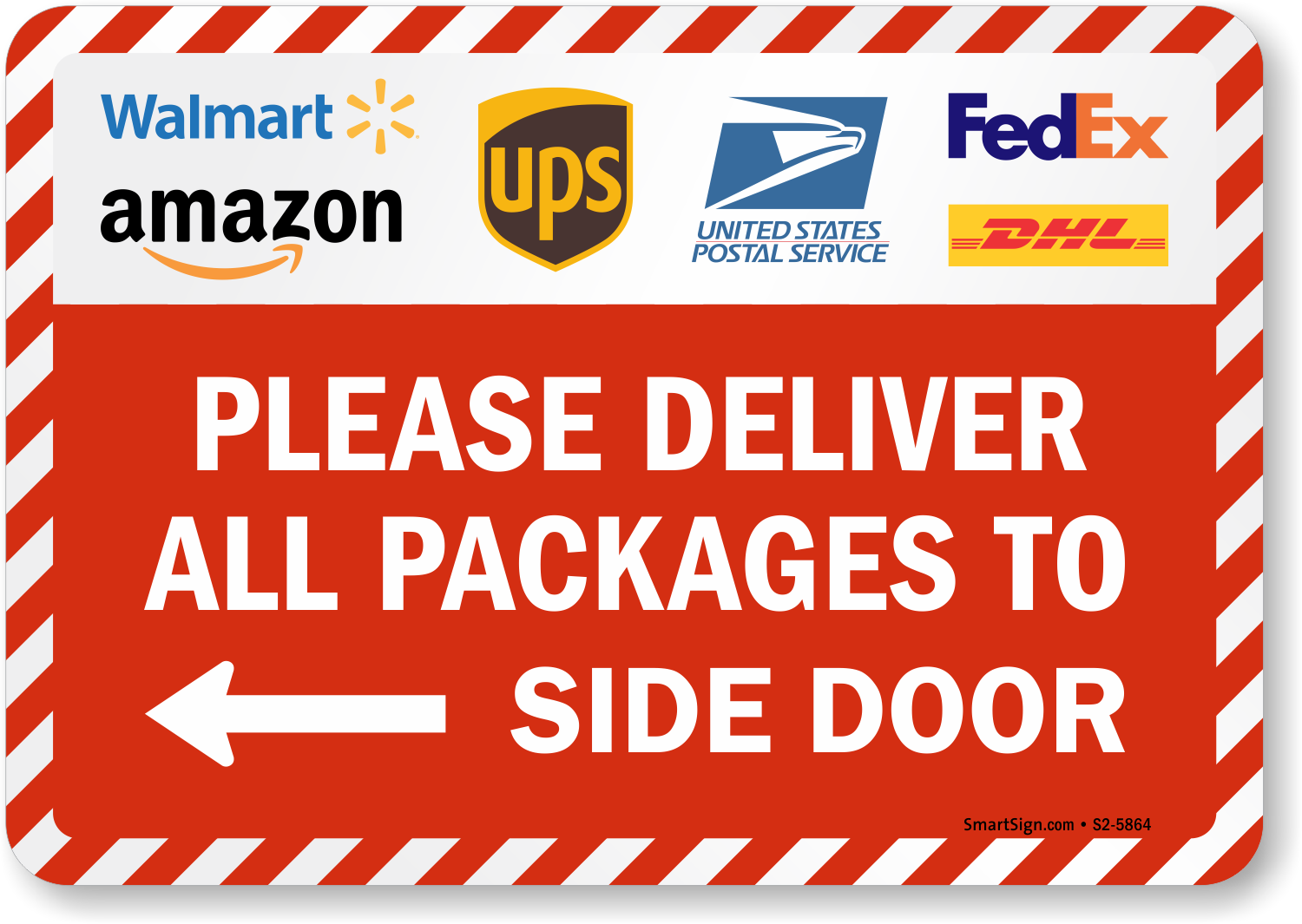 Package Delivery Sign: Please Deliver All Packages To Side Door (With Amazon, FedEx, Walmart, UPS & USPS, DHL Graphics) (Choose Right/Left Arrow) S2-5864 Learn More...