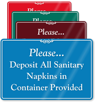 Encourage good hygiene practices in female bathrooms. Put up this ShowCaseâ„¢ Wall Feminine Hygiene Sign to make sure the bathroom is kept clean of sanitary napkins.