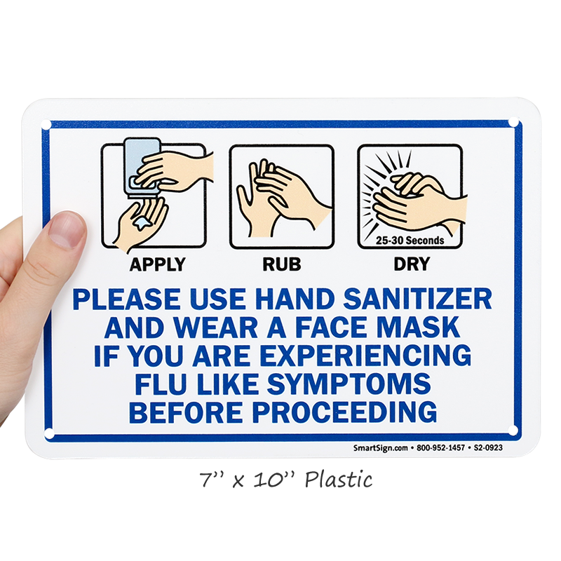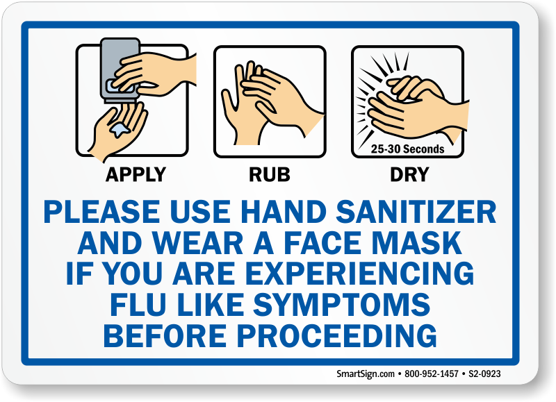 Sanitizing hands and wearing face mask on experiencing flu like symptoms in a good practice to prevent cross-contamination. Use this sign as a healthy reminder.