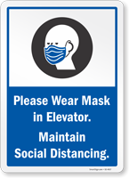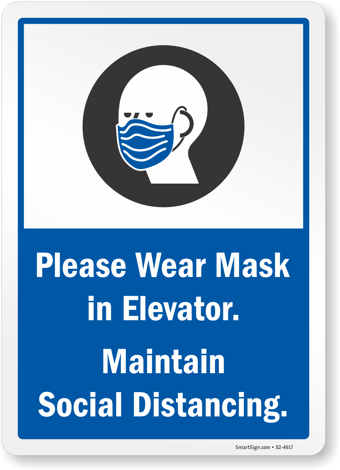 With contrasting colors and a neat layout, this sign makes a rather efficient way to have people wear masks and practice social distancing in elevators.