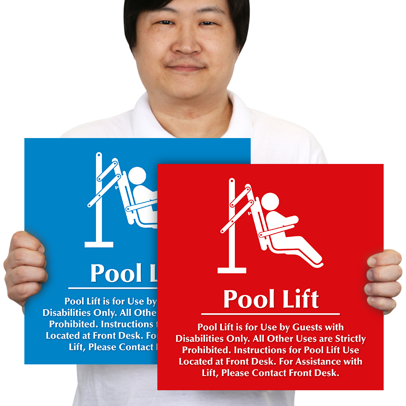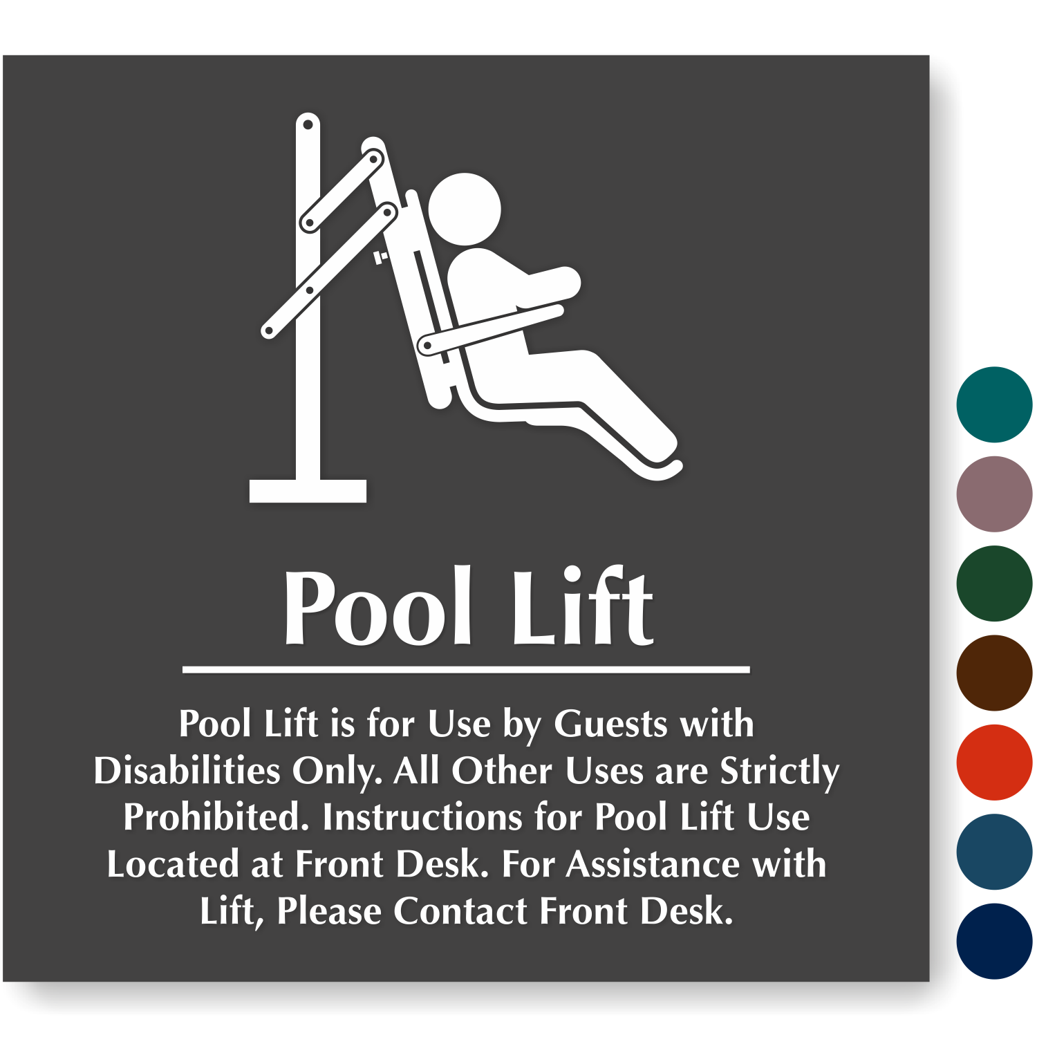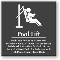 TactileTouchâ„¢ Poolside ADA Lift Sign, 12 in. x 12 in.: Pool Lift Is For Use By Guests With Disabilities Only. All Other Uses Are Strictly Prohibited. Instructions For Use Located At Front Desk. For... SE-5638