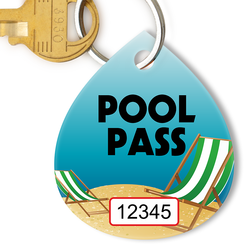 Pool Pass Tag with Consecutive Numbers: Water Drop Pool Pass with Beach Chair Design (Key Ring/Companion Product) TG-1354 Learn More...