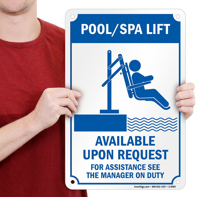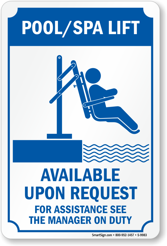 Pool/Spa Handicap Lift Sign: Available Upon Request - For Assistance See The Manager On Duty (With Handicap Pool Lift Graphic) S-9983 Learn More...