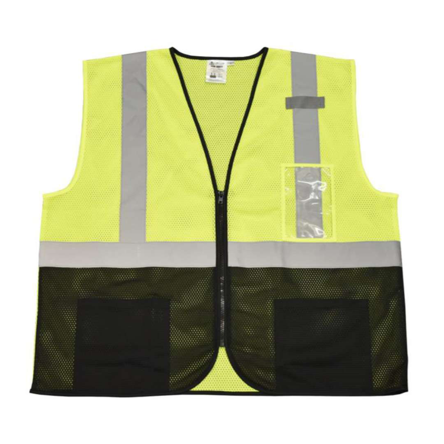 Two-toned, black and lime-green polyester mesh safety vest with a zipper closure.