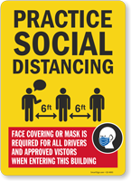 Mandate social distancing and wearing face masks for drivers and visitors entering your facility. The sign is offered in different sizes and layouts to suit different needs.