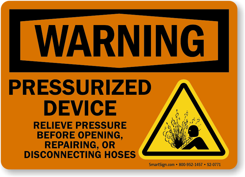 OSHA Warning Sign: Pressurized Device, Relieve Pressure Before Opening, Repairing Or Disconnecting Hoses (Symbol) S2-0771