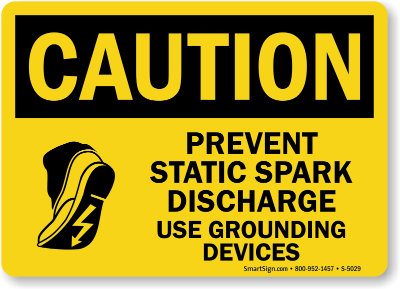 Increase awareness about electrical hazards in your facility and promote safety. Use this OSHA Caution Static ESD sign and inform employees to use grounding devices in order to prevent static spark discharge.