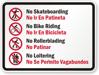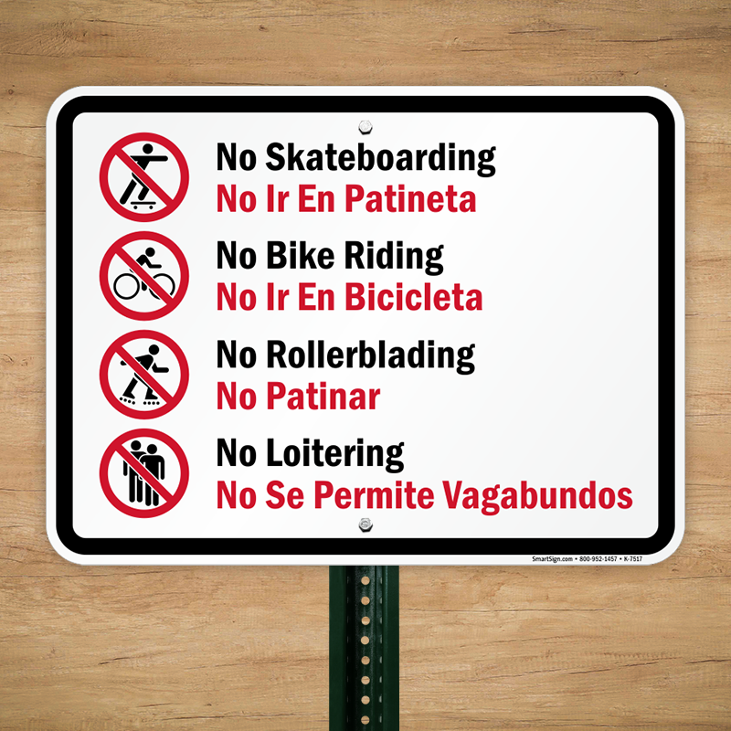 Bilingual No Skateboarding Sign: No Bike Riding, No Roller Blading, No Loitering - No Ir En Bicicleta, No Se Permite Vagabundos (English/Spanish) K-7517