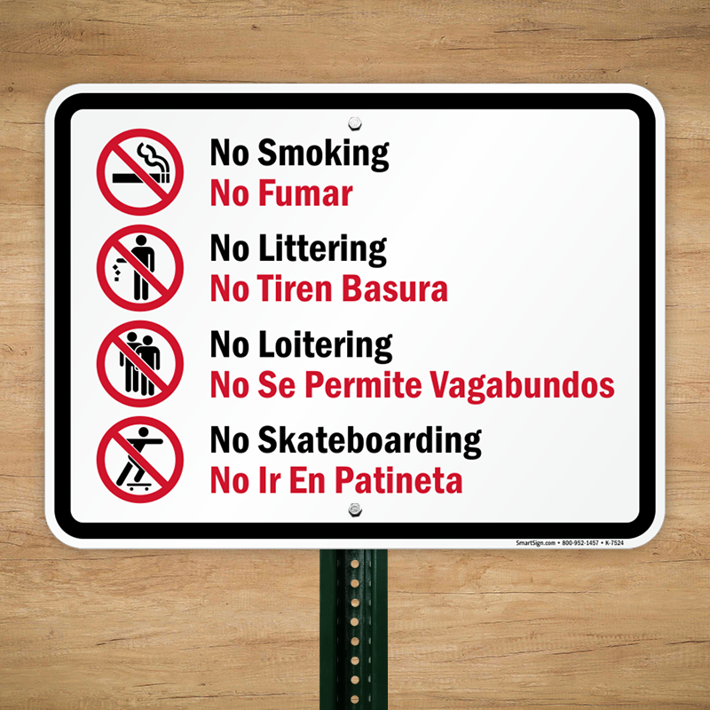 Bilingual No Smoking Sign: No Littering, No Loitering, No Skateboarding / No Fumar, No Tiren Basura (English/Spanish) K-7524
