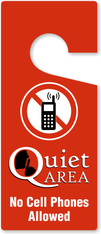 With two graphics, this door hang tag informs of quiet area where using cell phones is not allowed.
