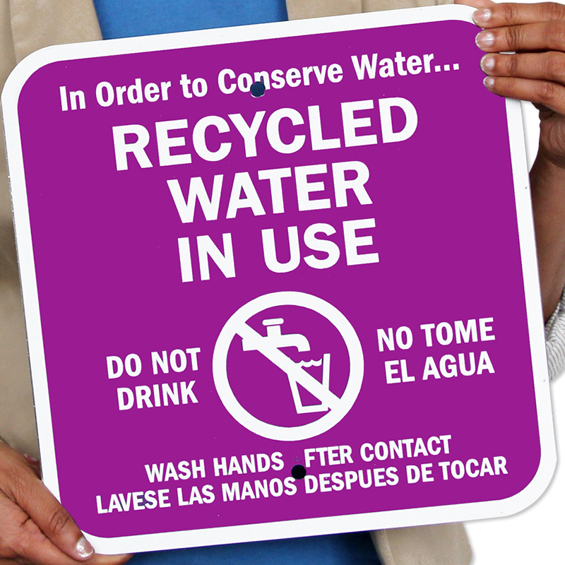Use a "recycled water in use do not drink (with graphic)" sign. Signs are popular for a reason.