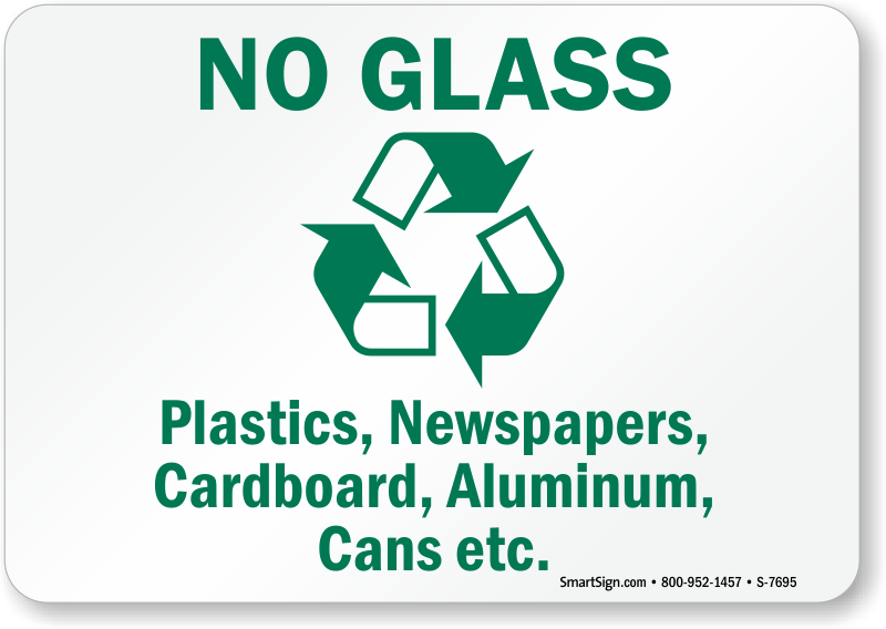 Recycling Sign: No Glass, Plastics, Newspapers, Cardboard, Aluminum, Cans etc. (with Graphic) S-7695