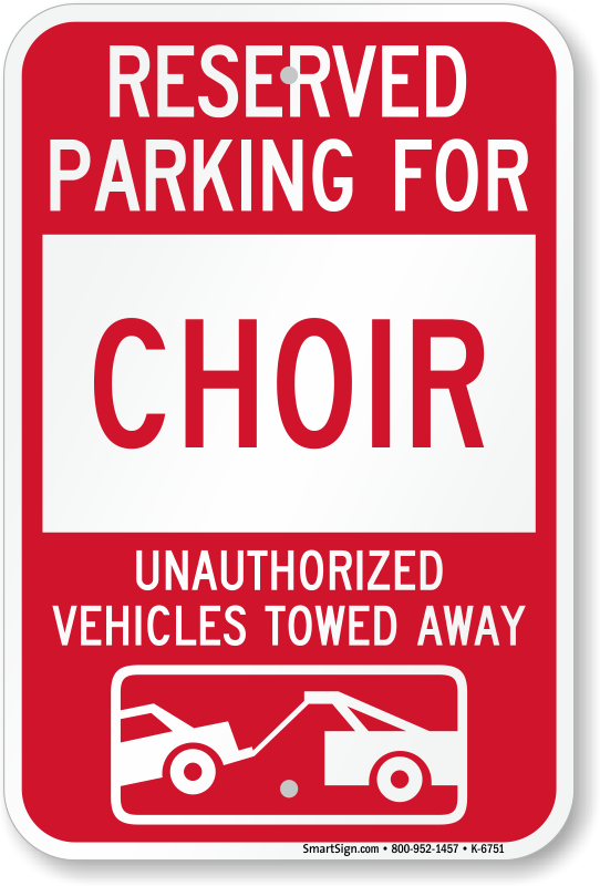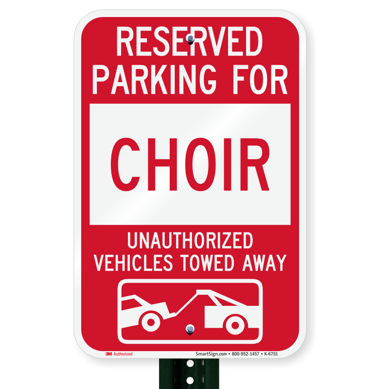 Parking Lot Sign: Reserved Parking For Choir Unauthorized Vehicles Towed Away (With Tow Away Graphic) K-6751 Learn More...