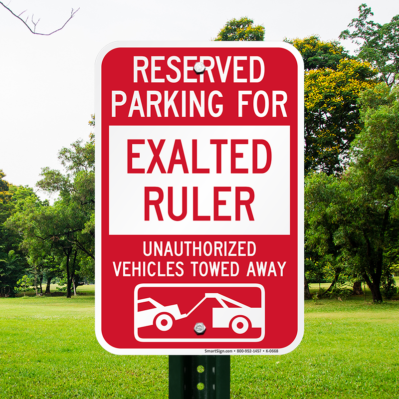 Novelty Parking Lot Sign: Reserved Parking For Exalted Ruler Unauthorized Vehicles Towed Away (With Tow Away Graphic) K-0668 Learn More...