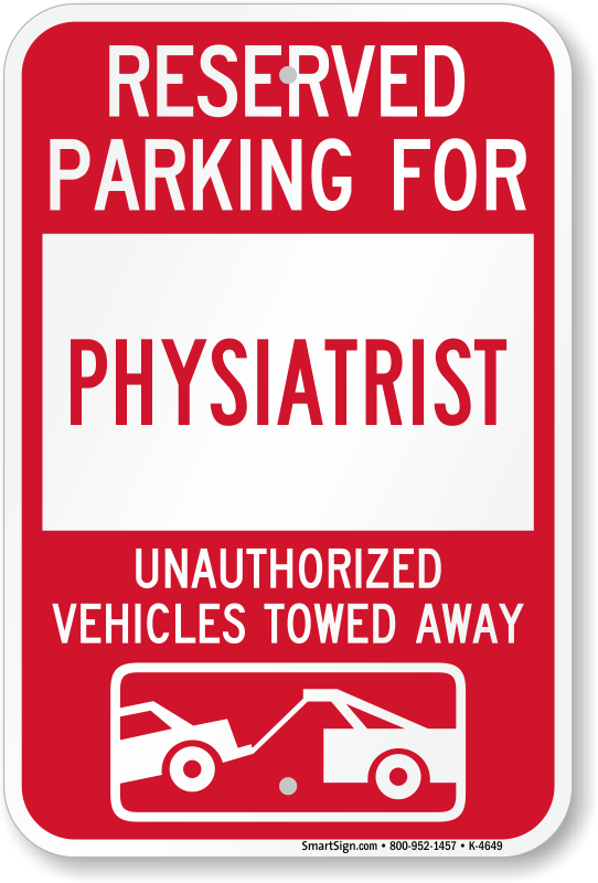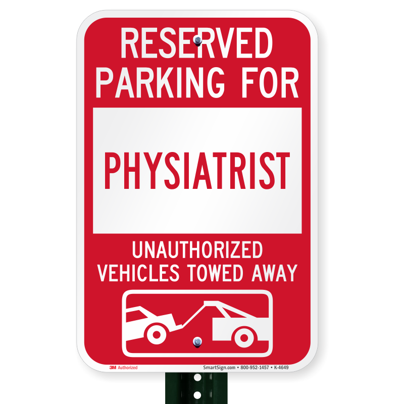 Parking Lot Sign: Reserved Parking For Physiatrist Unauthorized Vehicles Towed Away (With Tow Away Graphic) K-4649 Learn More...