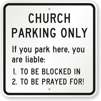 Reserved Parking Sign: Church Parking Only If You Park Here, You Are liable. 1. To be Blocked In, 2. To Be Prayed For!