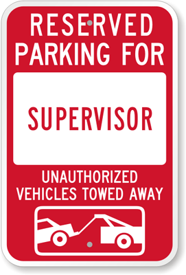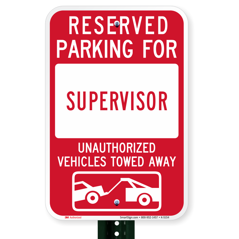 Tow Away Sign: Reserved Parking For Supervisor : Unauthorized Vehicles Towed Away K-5154 Learn More...