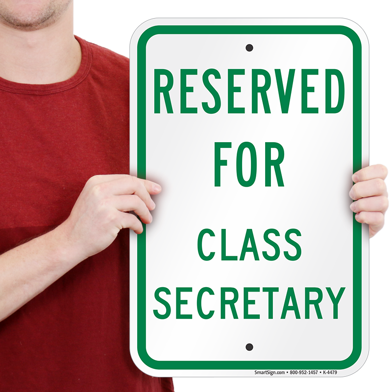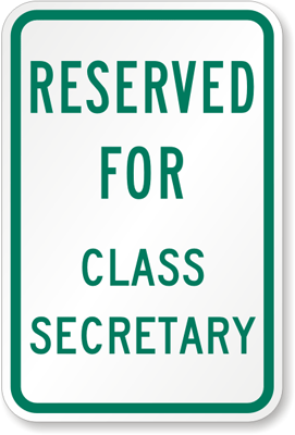 Parking Sign: Reserved For Class Secretary K-4479 Learn More...