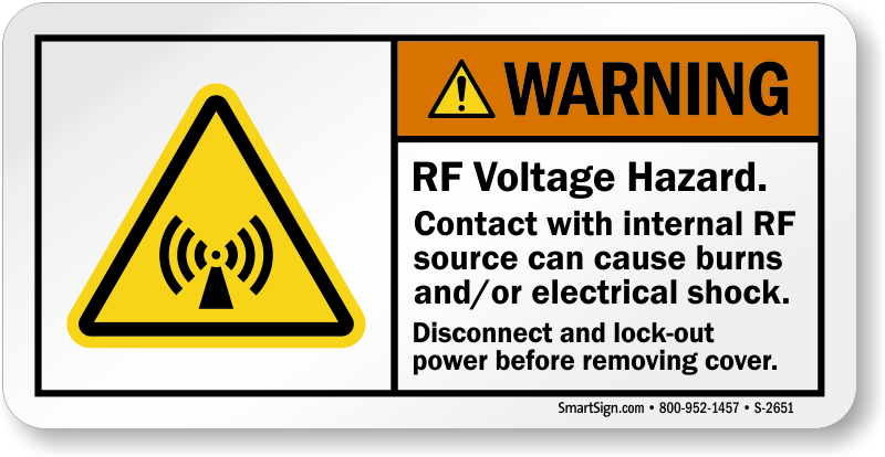 This ANSI Warning label gives out warning against the burn and electric shock hazards of RF Voltage. Deploy this and remind workers to lock out power before removing cover.