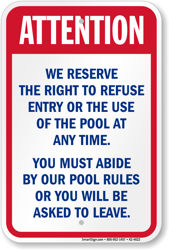 Pool Safety Sign: Attention - We Reserve The Right To Refuse Entry Or The Use Of The Pool At Any Time. You Must Abide By Our Pool Rules Or You Will Be Asked To Leave. K2-4622 Learn More...