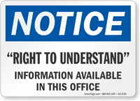 OSHA Notice Sign: “Right To Understand” Information Available In This Office