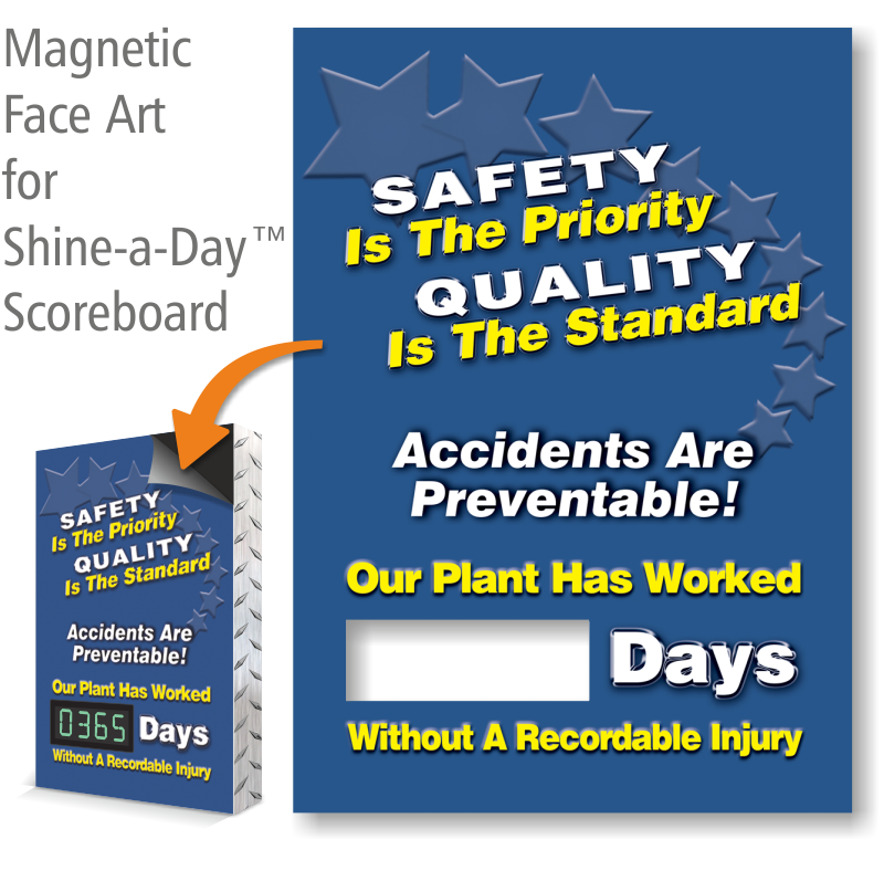 The innovative magnetic system on this Changeable Shine-a-Day™ Face allows you to update your safety message by effortlessly swapping out the magnetic face on your Shine-a-Day™ Magnetic Backboard Scoreboard.