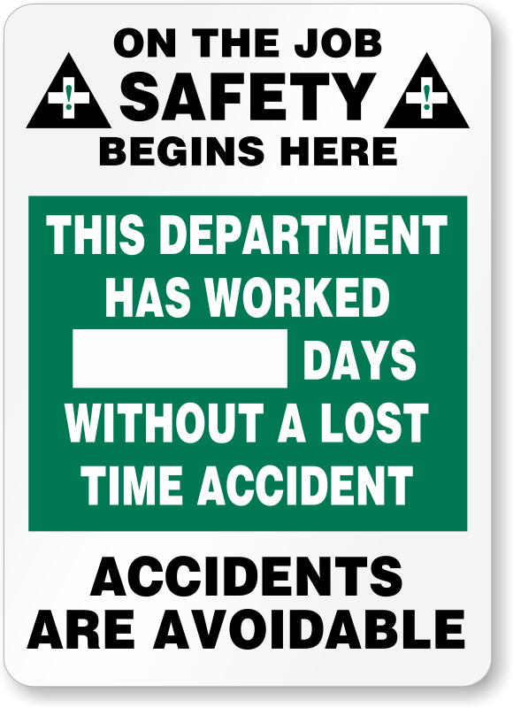 Mark-a-Dayâ„¢ Safety Scoreboards: On the Job Safety Begins Here. This Department has Worked [****] Days Without a Lost Time Accident. Accidents are Avoidable. S-5002 Learn More...