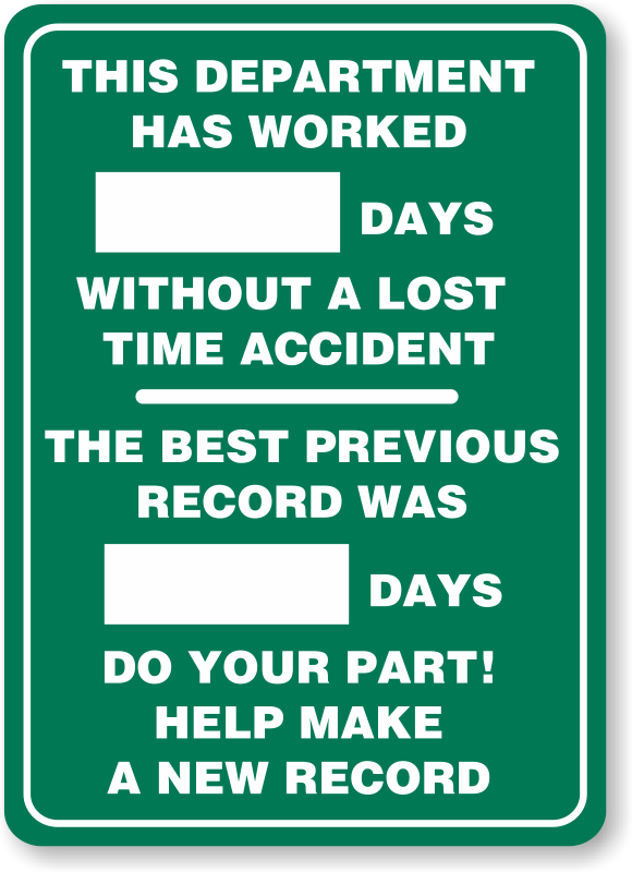 Mark-a-Dayâ„¢ Safety Scoreboards: This Department has Worked [****] Days Without a Lost Time Accident. The Best Previous Record Was [****] Days. Do Your Part! Help Make a New Record. S-5008 Learn More...