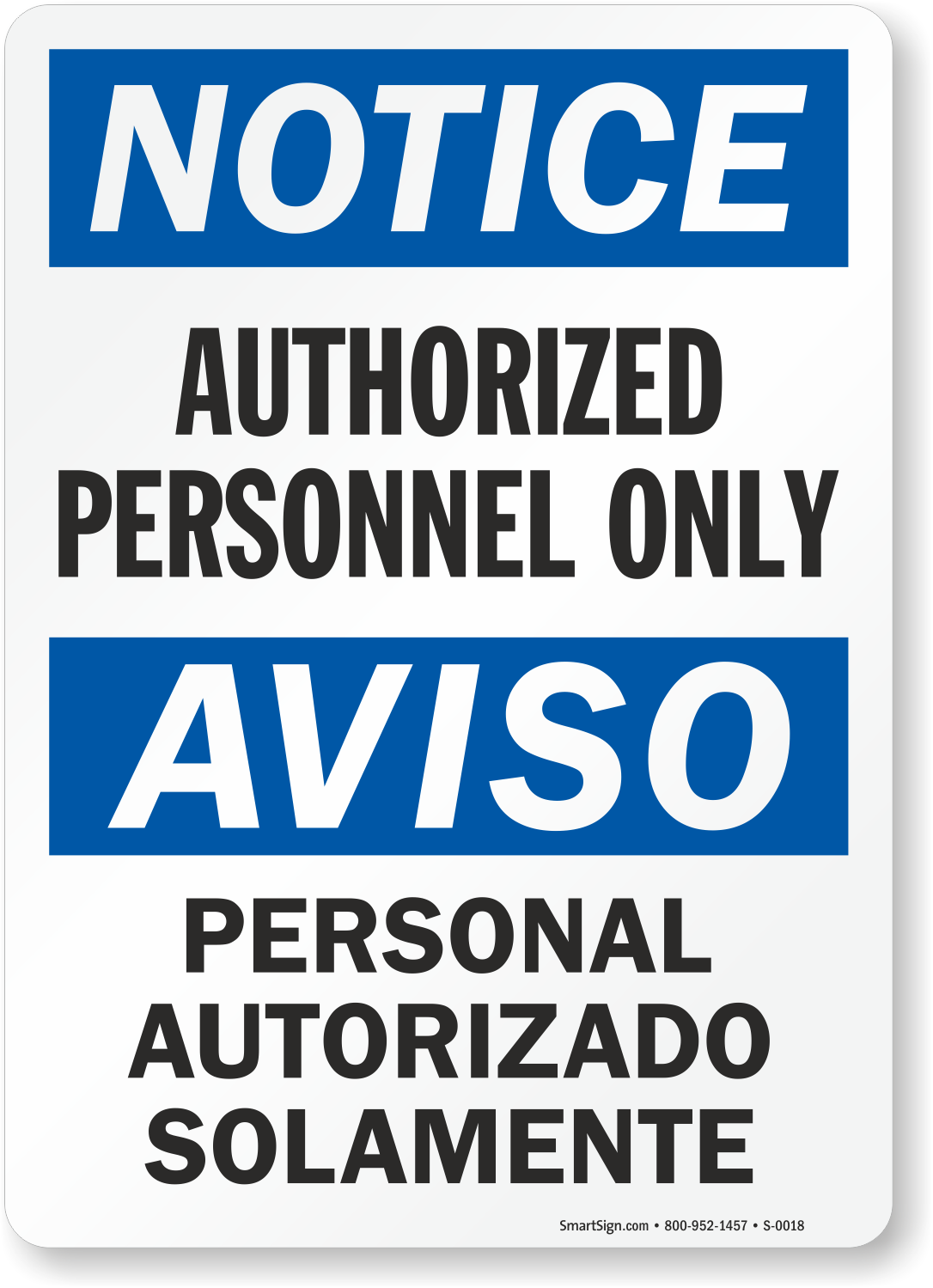 This bilingual notice sign designates an area for authorized personnel only in English and Spanish.