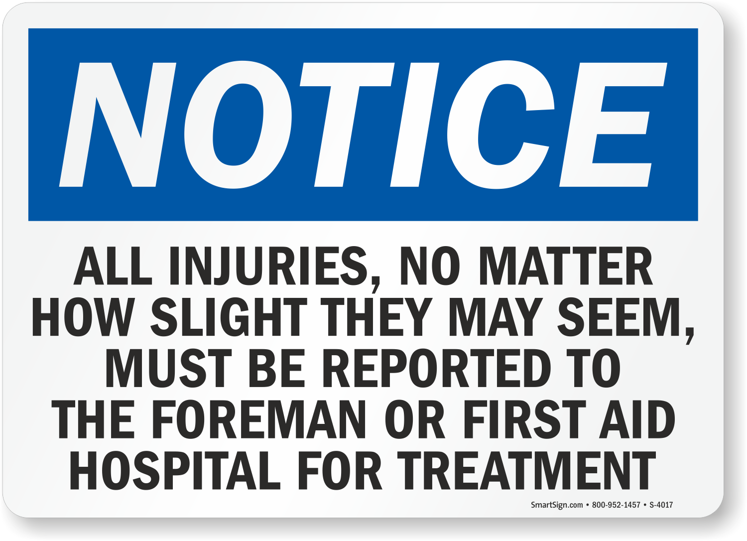 Don’t let accidents go unreported. Use a "all injuries, no matter how slight they may seem, must be reported to the foreman or first aid hospital for treatment" sign. A sign is powerful.