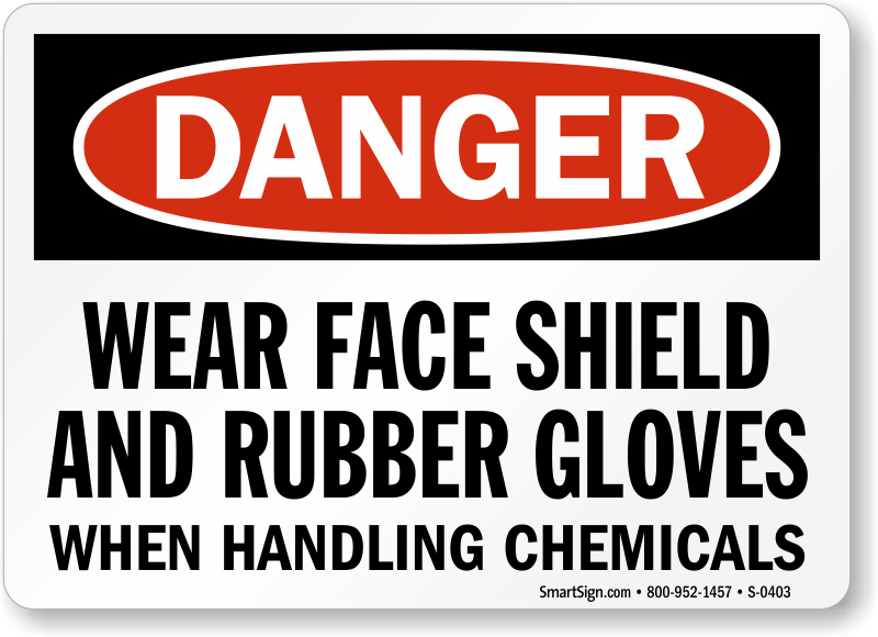 Prevent chemical accidents. Use a "wear face shield and rubber gloves when handling chemicals" sign.
