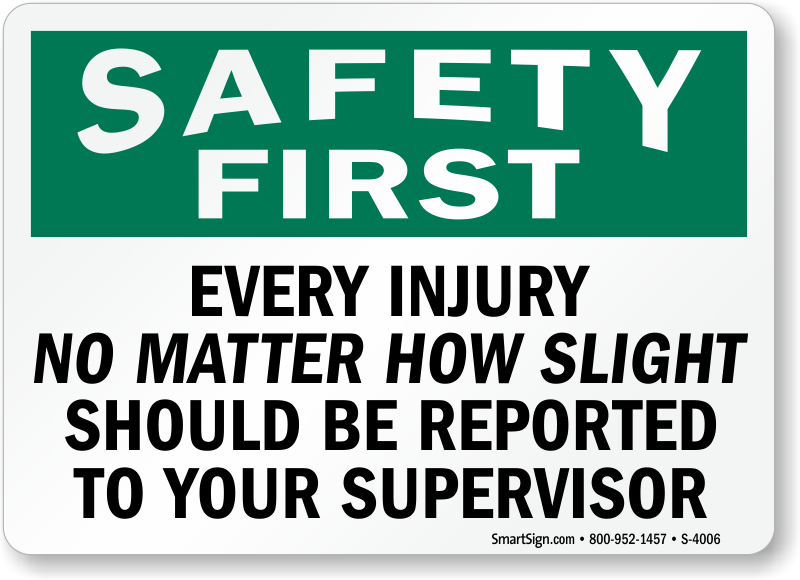 Don't let accidents go unnoticed. Use a "every injury, no matter how slight should be reported to your supervisor" sign.