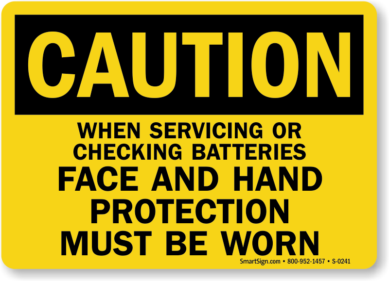 Protect your workforce. Use a "when servicing or checking batteries face and hand protection must be worn" sign.