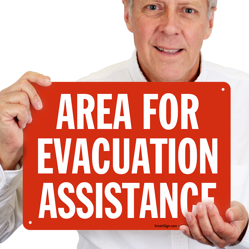 Fire safety is important. Use a "area for evacuation assistance (white on red)" sign. Signs make a difference.