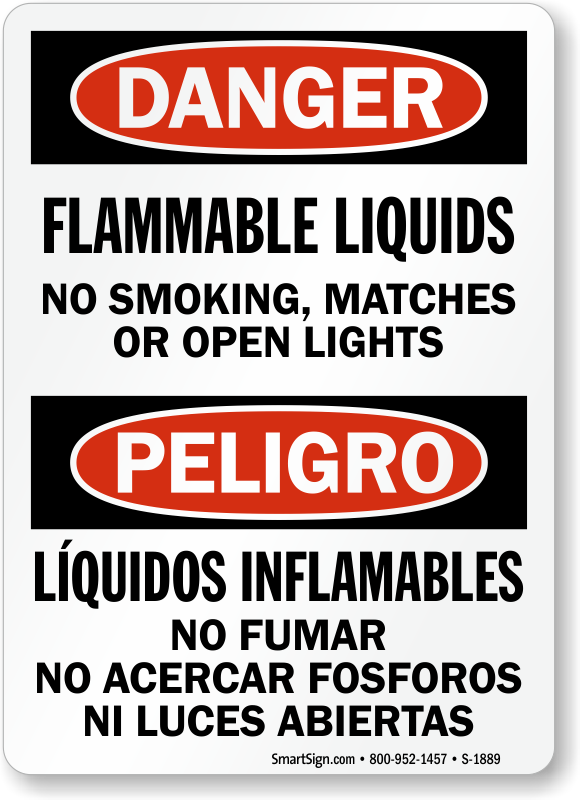 Use a "flammable liquids no smoking, matches or open lights" bilingual sign. Underline the value of avoiding accidents.