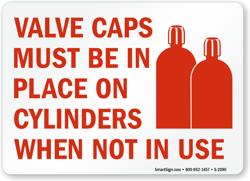 Use a "valve caps must be in place on cylinders when not in use (with graphic)" sign.