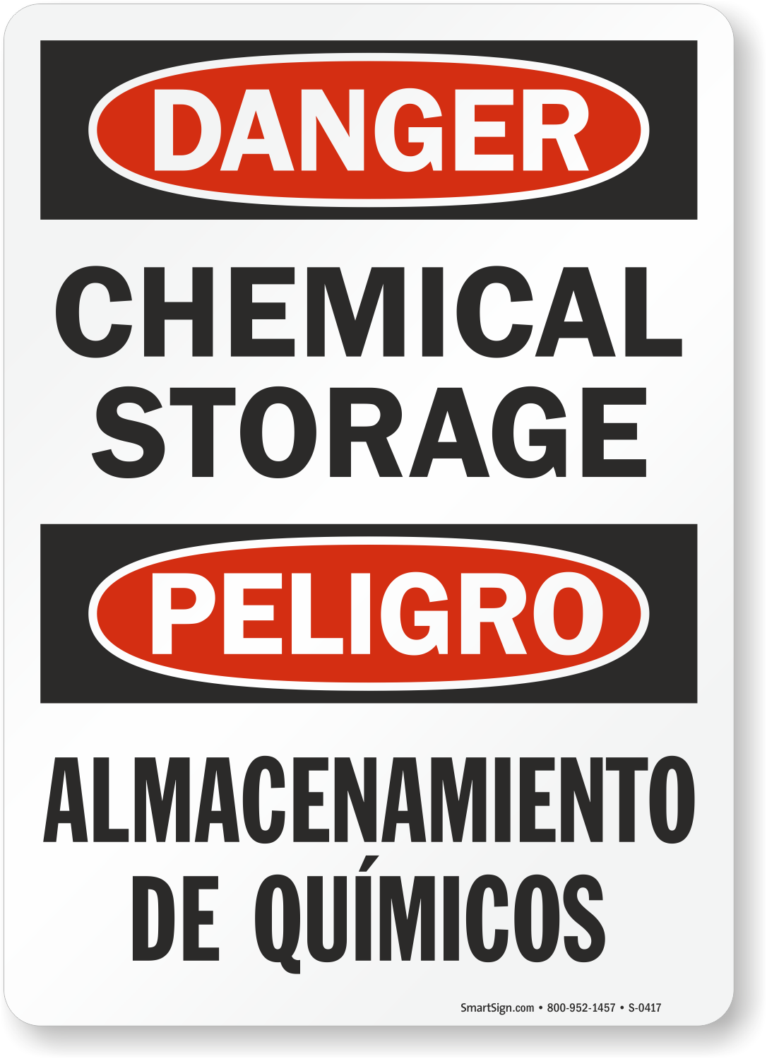 Mark chemical storage in English and Spanish with a bilingual Danger sign.
