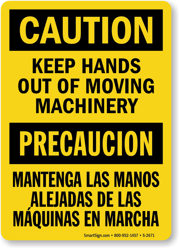 Bilingual OSHA Caution / Precaucion Sign: Caution Keep Hands Out Of Moving Machinery / Precaucion Mantrnga Las Manos Alejadas De Las Maquinas En Marcha S-2671