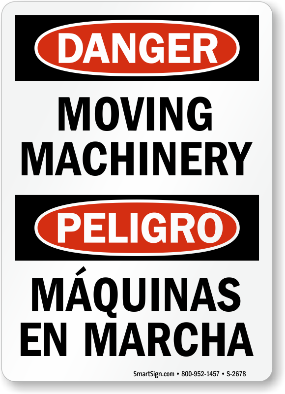 Signs are a great way to remind everyone about safety. Use a bilingual Moving Machinery sign to alert people to the danger.