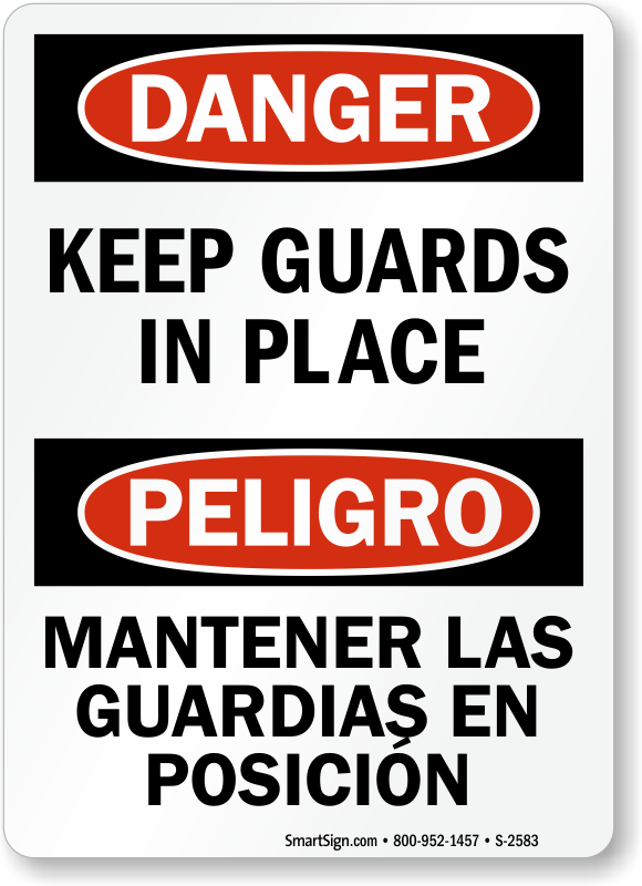Remind workers to keep safety equipment operational. Bilingual. Use a "keep guards in place " sign.