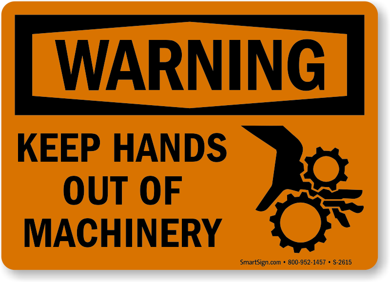 Use a "keep hands out of machinery" sign. Make sure hazards are clearly marked.