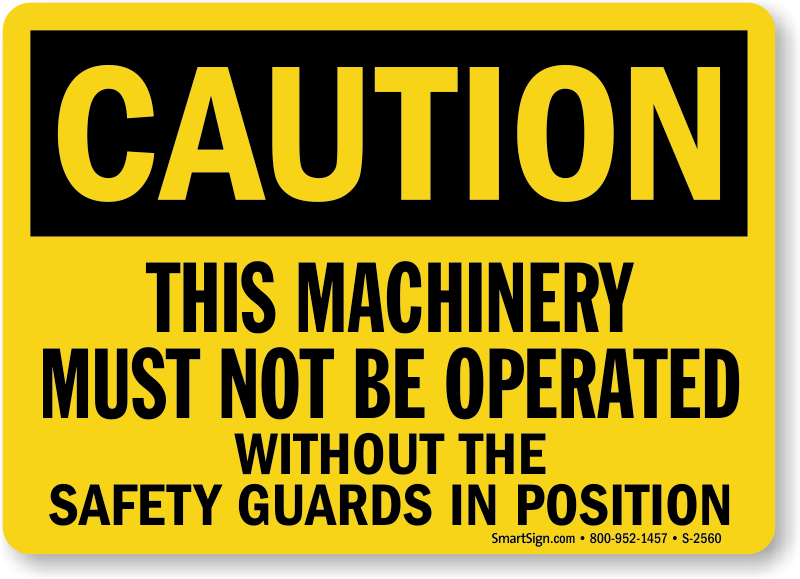 OSHA Caution Sign: This Machinery Must Not Be Operated Without The Safety Guards In Position