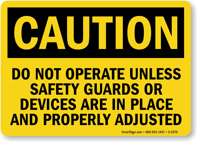 OSHA Caution Sign: Do Not Operate Unless Safety Guards Or Devices Are In Place and Properly Adjusted S-2576