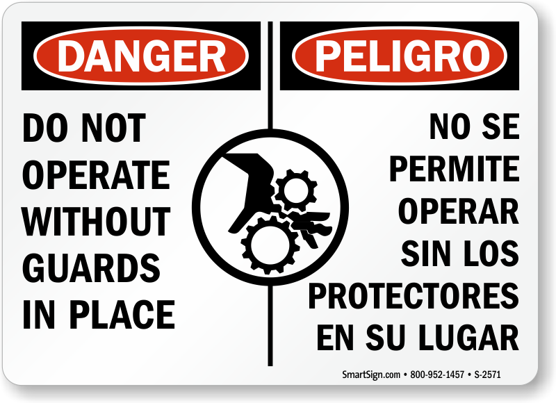 This bilingual danger sign comes with a terrifying graphic to discourage anyone from operating equipment without safeguards.