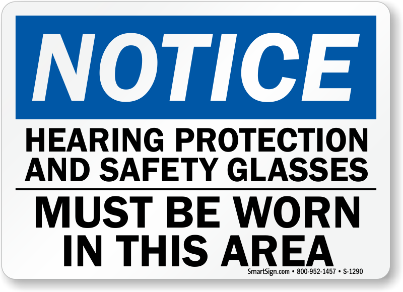 Use a "hearing protection and safety glasses must be worn in this area" sign. Designed to be effective.