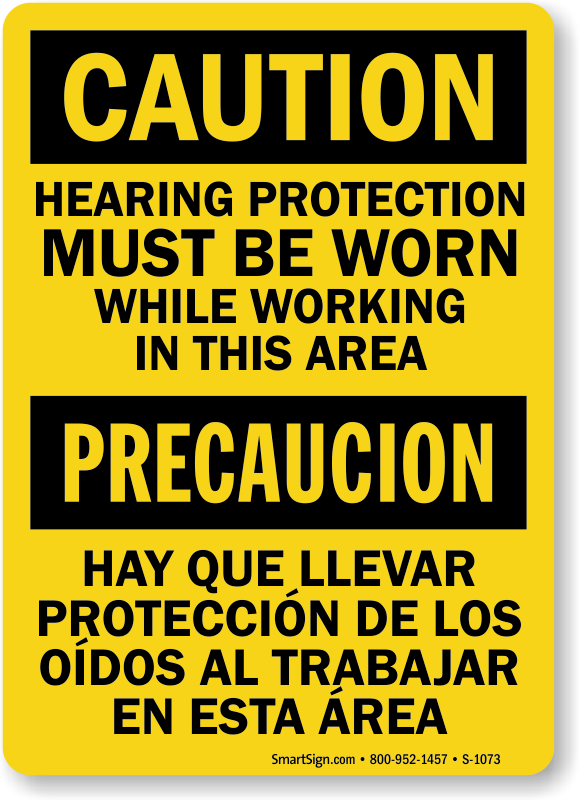 Bilingual OSHA Caution / Precaucion Sign: Hearing Protection Must Be Worn While Working In This Area / Hay Que Llevar Protección De Los Oídos Al Trabajar En Esta Área Learn More...