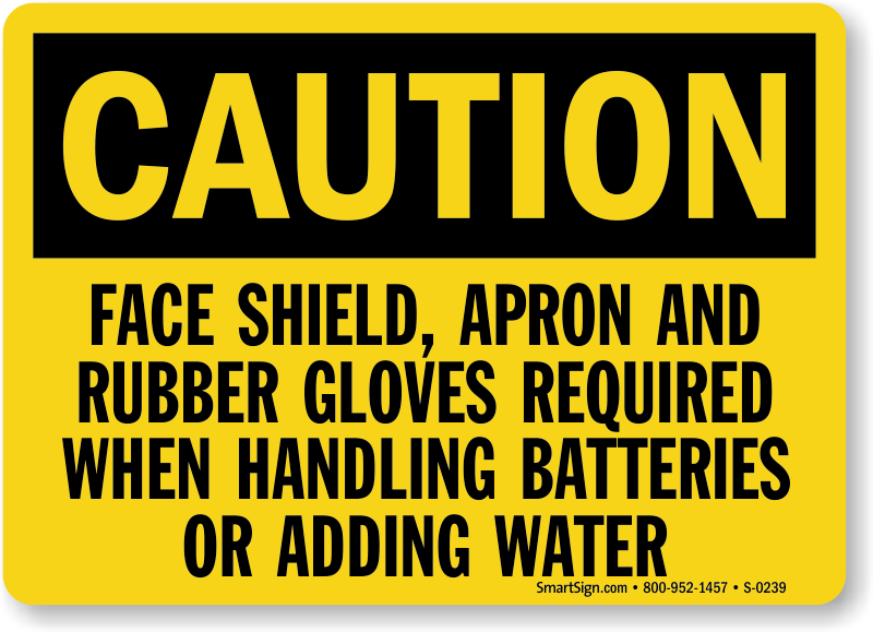 Use a "face shield, apron and rubber gloves required when handling batteries or adding water" sign.