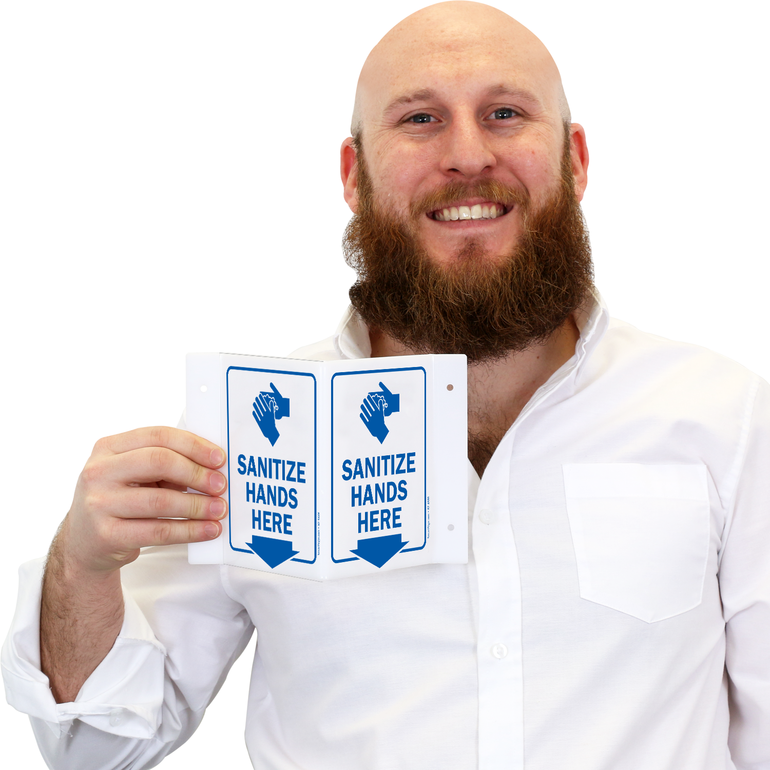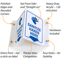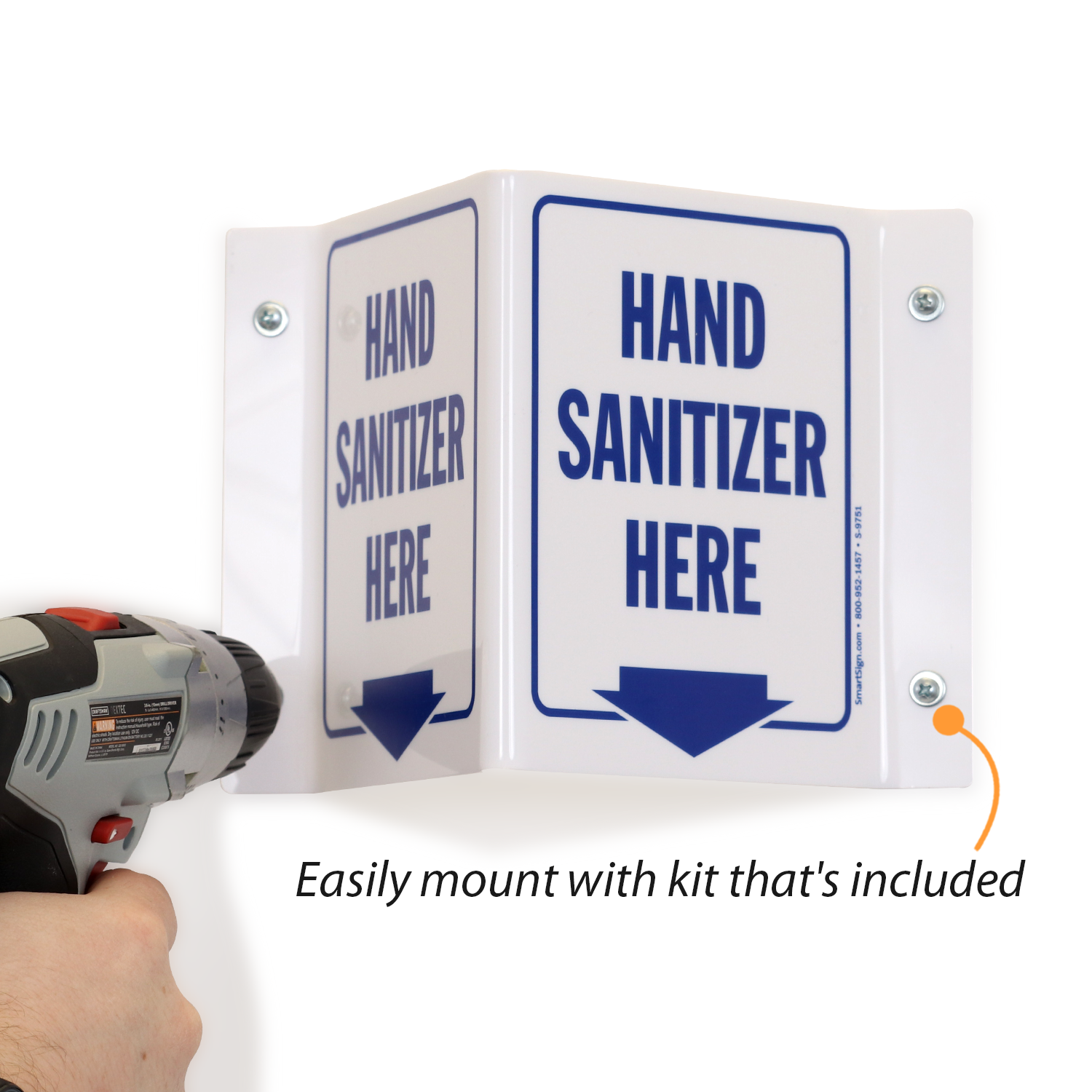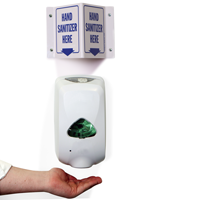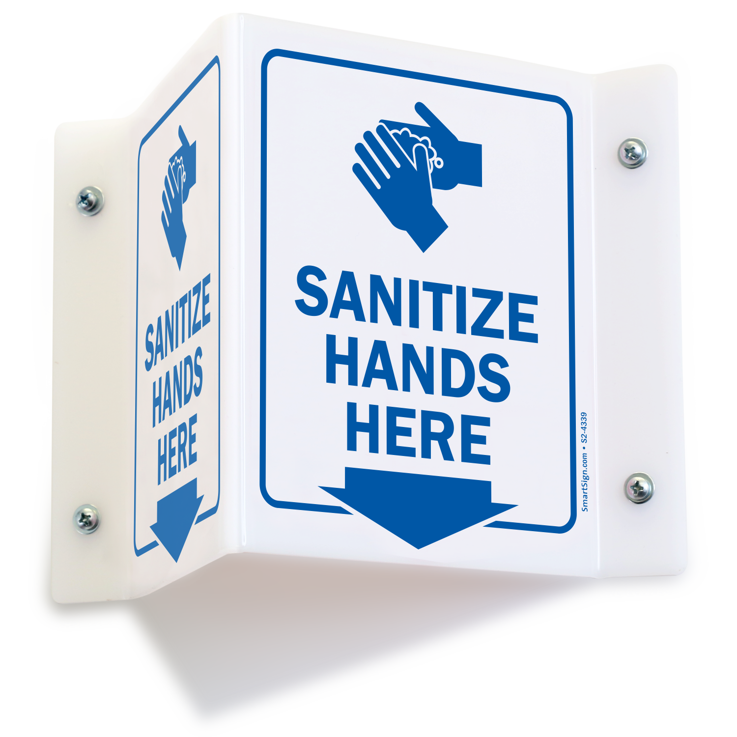 - Projecting sign can be mounted above your hand sanitizer dispenser so it's visible by people passing by. Message is printed on 2 sides of the sign so it's viewable from either end of the hall.