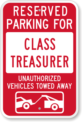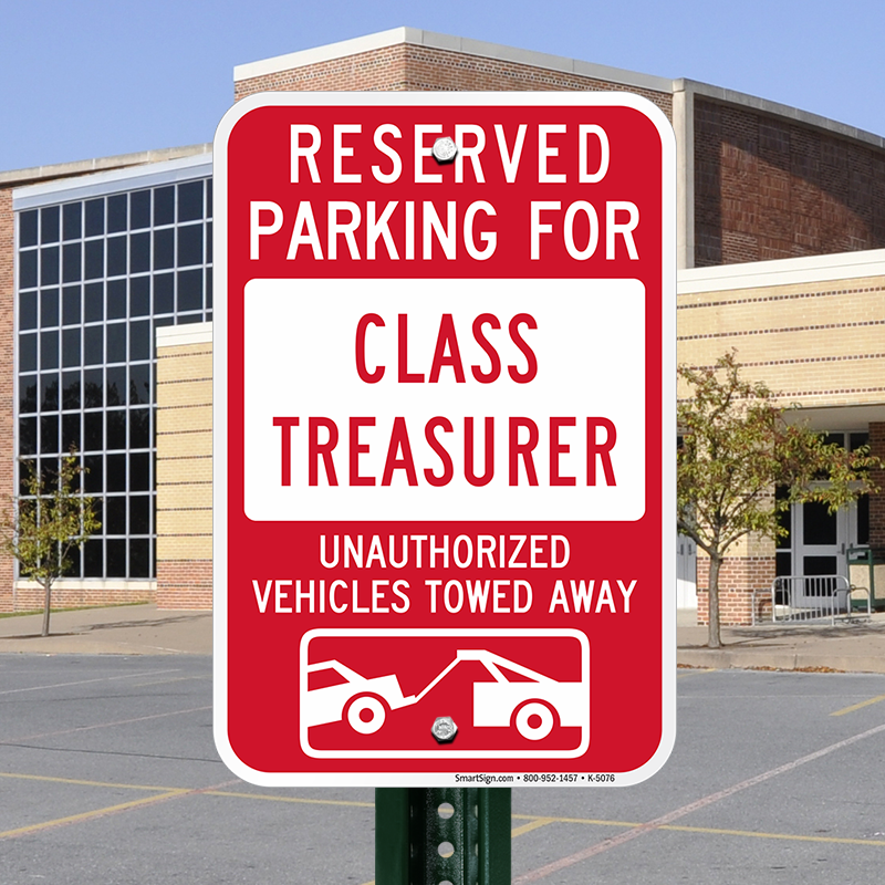 Tow Away Sign: Reserved Parking For Class Treasurer : Unauthorized Vehicles Towed Away K-5076 Learn More...